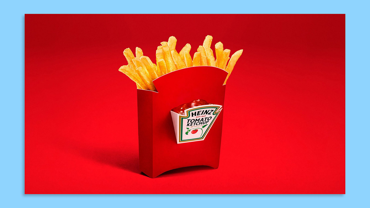 Pourquoi c’est intéressant — Cette campagne illustre une création de valeur via le design produit plutôt que via un contenu promotionnel classique, transformant un objet basique (la boîte de frites) en support narratif et outil d’expérience qui porte naturellement le message de la marque : Heinz est le compagnon indispensable des frites. Le produit lui-même raconte alors l’histoire : le packaging devient média, incarnant visuellement et fonctionnellement l’association frite + ketchup. Une approche guidée par un usage client très concret et quotidien pour s’attaquer à un irritant (les gens veulent saucer sans se salir) en apportant une solution tangible… et donc une innovation utile.